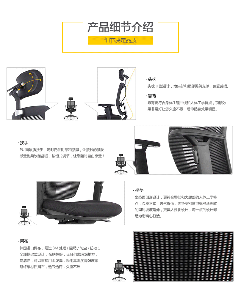 CG-E1053的优美设计有利于持久的舒适和美感。工学椅的结构和功能利用同步倾仰底盘控制功能锁定,滑座和高度调节。高度和角度均可调的扶手和头枕都包含在这张特有的工学椅里。